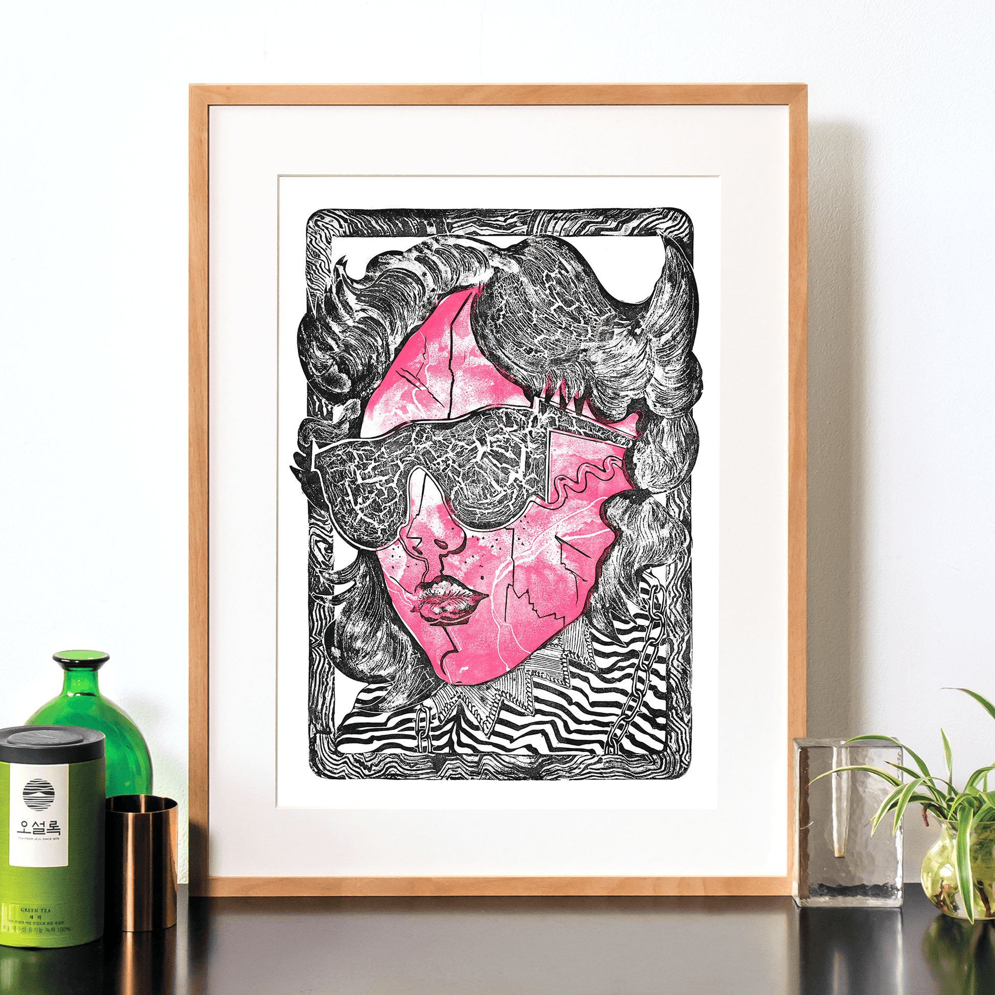 Sunburned I (Unknown Pinkface) (2021), 2-block etched linocut.